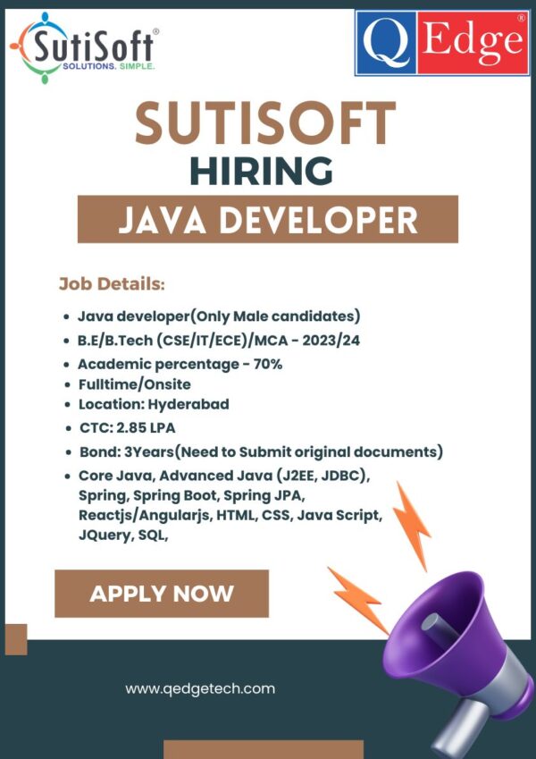 Company: SutiSoft Job Role: Java DeveloperEmployment Type: Full-Time (Onsite)Location: Hyderabad Job Details: Position: Java Developer Experience Required: Freshers Only Education: B.E/B.Tech (CSE/IT/ECE)/MCA Years of Passout 2023-2024 Graduation Percentage – 70% Skills Required: Core Java Advanced Java (J2EE, JDBC) Spring Spring Boot Spring JPA Reactjs/Angularjs… Continue Reading →