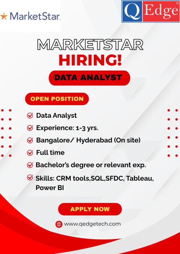 Company: MarketStar Job Role: Data AnalystEmployment Type: Full-Time Location: Bangalore/ Hyderabad (On site) Job Details: Position: Data Analyst Experience Required: 1-3 years Education: Bachelor’s degree or relevant exp. Skills Required: CRM tools SQL SFDC Tableau Power BI CTC: Based on Experience… Continue Reading →