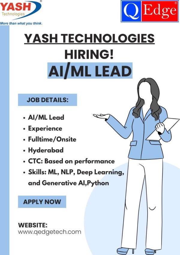 Company: YASH TechnologiesJob Role: AI/ML LeadEmployment Type: Full-Time (Onsite)Location: Hyderabad Job Details: Position: AI/ML Lead Open for Experience Education: Any Graduate CTC: Based on performance Skills Required: ML, NLP, Deep Learning, Generative AI, Python Website: www.qedgetech.com Eligible candidates are requested to APPLY FOR THIS JOB.