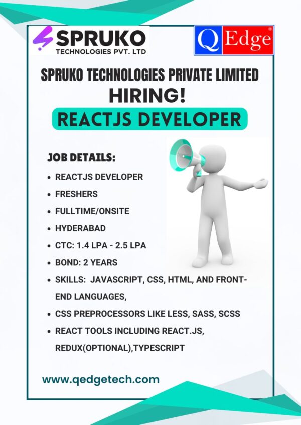 Company: SPRUKO TECHNOLOGIES PRIVATE LIMITEDJob Role: ReactJS Developer.Employment Type: Full-Time (Onsite)Location: Hyderabad Job Details: Position: ReactJS Developer. Open for Freshers Education: Any Graduate CTC: upto 2.5Lpa Based on performance Bond: 2 years Skills Required: JavaScript, CSS, HTML, front-end languages, React.js, Redux(optional), Typescript Website: www.qedgetech.com Eligible… Continue Reading →