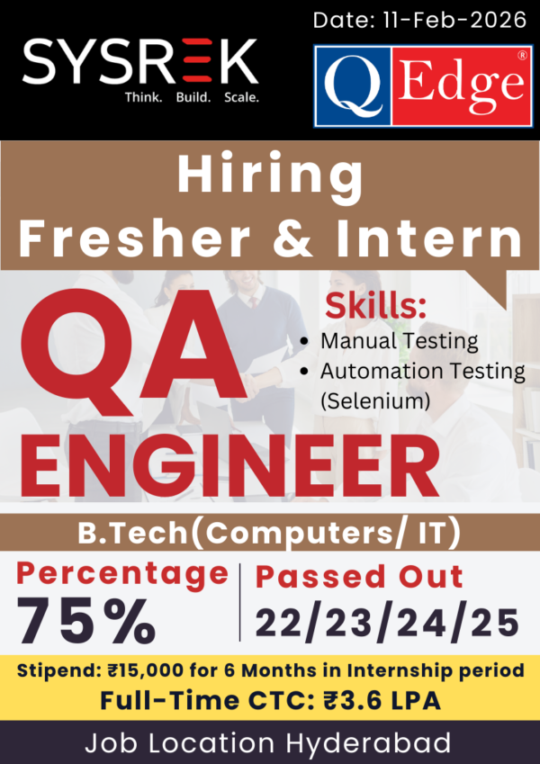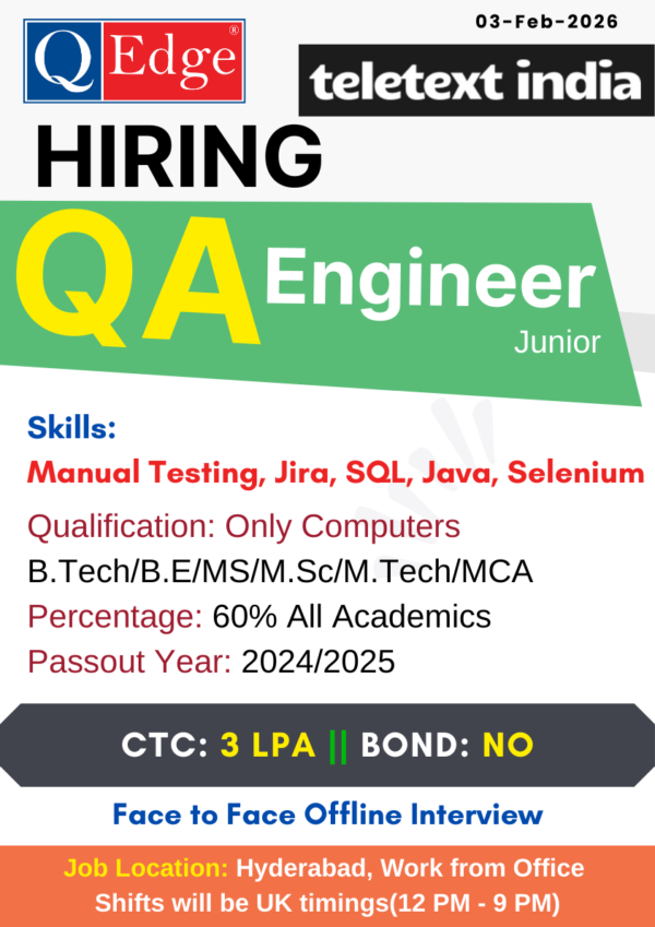 QEdge in association with Teletext India is hiring Junior QA Engineers for an exciting opportunity in Hyderabad. This role is ideal for fresh graduates looking to start their career in software testing with hands-on exposure to real-time projects. Role &… Continue Reading →
