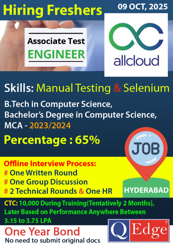 Job Title: Associate Test Engineer Company: AllCloud Job Location: Hyderabad Job Description AllCloud is hiring passionate and driven Associate Test Engineers to join our dynamic team. If you are eager to kickstart your career in testing and quality assurance, we’d… Continue Reading →